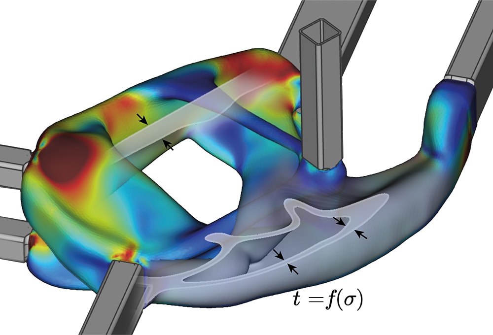 Proving out part geometries quickly and accurately, transferring directly to printers as toolpaths without error-prone triangles, is where computational engineering tools shine. Concurrent with the geometric optimization phase of a part designed for AM, the software provides an “architected materials” functionality, with which the overall geometry of the structure is automatically adjusted into free-flowing densities and/or varying wall-thicknesses, based on those critical multiphysics-field inputs like stress or temperature distribution.