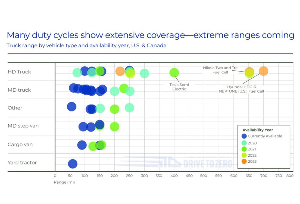 “We are already seeing a healthy number of zero-emission transit and school buses rated for at least 100 miles, and the zero-emission trucks currently on the market offer similar ranges,” said Ben Mandel, CALSTART’s Northeast Regional Director who leads the ZETI team. “In the coming two to three years, we expect to see a growing number of zero-emission medium- and heavy-duty trucks in the 200-mile or greater range, with a few extra long-distance models greater than 600 miles by 2023.”
