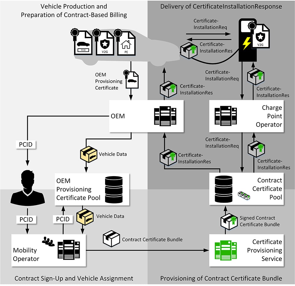 - When the EV is connected to a charging station, the contract certificate (stored on the vehicle and containing the digitally signed authentication token, as well as driver identification and billing info) is transmitted to the charging station