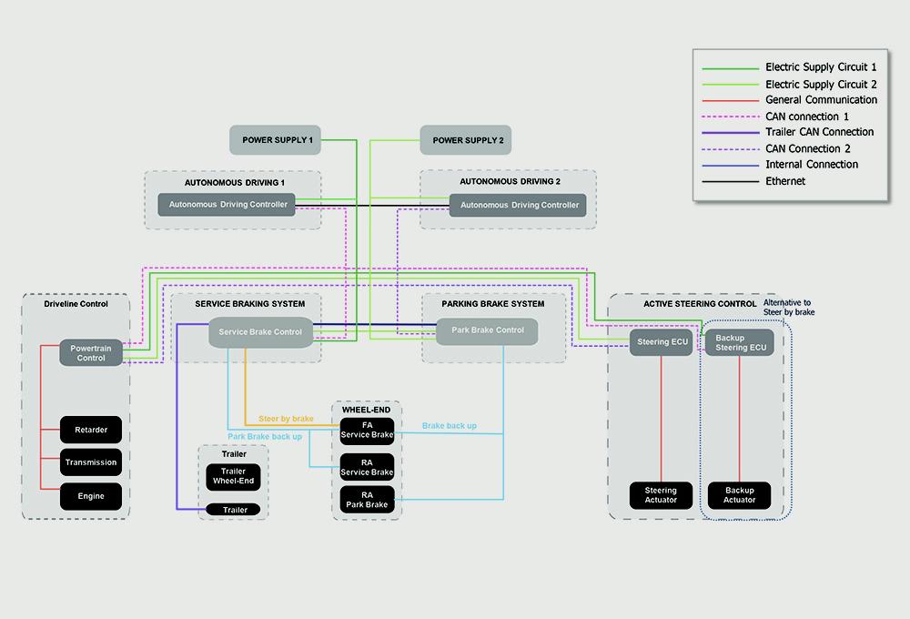 Incorporating the trailer into the failsafe and redundancy concept is vital to realizing the full potential of an autonomous-vehicle system setup, according to Wohltmann. “If today the driver might only apply the rear axle brake as a last resort in case of service brake failure, the automated system will integrate the front axle and trailer brakes based on ‘knowledge’ of performance and status and loading setup,” he said. “Experience from EBS and brake balancing can be used for a safer and more efficient holistic braking setup and utilized as redundancy.”