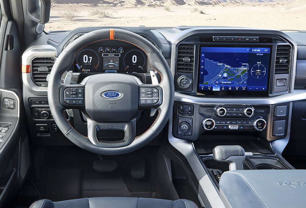 The 2021 Raptor receives much of the new in-cabin tech as the updated 2021 F-150, with small aesthetic tweaks to the new 12-inch display screen (optional in F-150) to control its off-road modes. A new electronic feature exclusive to the Raptor is a standard “Trail 1-Pedal Drive” designed to reduce rock-crawling stress. Trail 1-Pedal Drive permits throttle and brake control using only the accelerator pedal, braking proportionally as the driver lifts from the throttle.