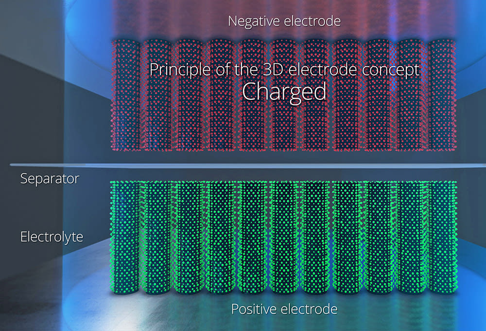 The 3D electrode is designed for manufacturability, he said. The VACNT manufacturing process is “very similar” to the production of photovoltaics or industrial glass treatment. Boulanger claimed that nanotubes are “not expensive” to produce: the equipment is proven, and processes are greatly improving both in throughput and yield, keeping costs low. “We envision it can be similar in terms of dollars-per-square-meter to a coating, but with a lower bill-of-materials coming from the natural and sustainable carbon sources. We will have more energy per square meter, the cost of that energy will be lower in terms of dollars-per-watt-hour, too,” Boulanger said.