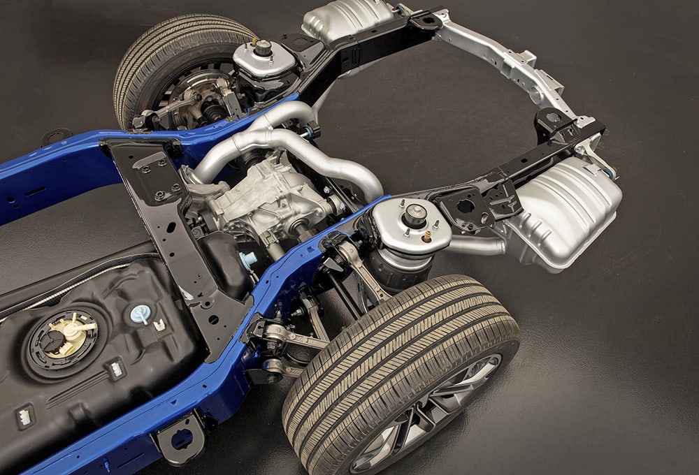 The Wagoneer’s chassis is composed of a high-strength steel frame with steel body panels excepting the hood/doors (aluminum) and liftgate (composite). The frame’s side rails are fully boxed and frame crossmembers are double sheer welded to the inside and outside of the frame for improved stiffness. “We have a unique and clever design in the rear of the frame where you notice very planar, straight frame rails,” Uhlmeyer noted. “This allowed us to achieve some important best-in-class vehicle occupant-package numbers, improve enter/egress and provide a flat load floor.”