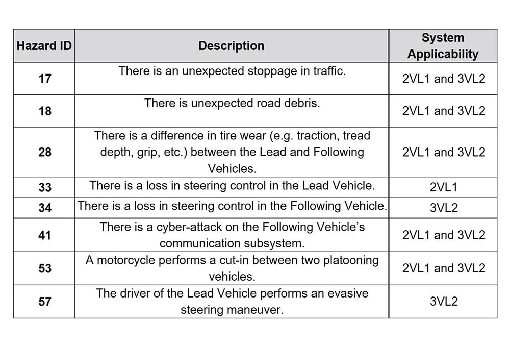 “Most of these [initial hazards] went to green, which is the lowest ASIL [Automotive Safety Integrity Level] rating, with appropriate safety mitigations,” said Svenson. “A few did not get reduced to the green level, so these are the hazards that were selected for further analysis to develop safety countermeasures.” For example, a cyber-attack on the following vehicle’s communication subsystem, which impacted both the 2VL1 and 3VL2 systems, was one such hazard that required SOTIF analysis.