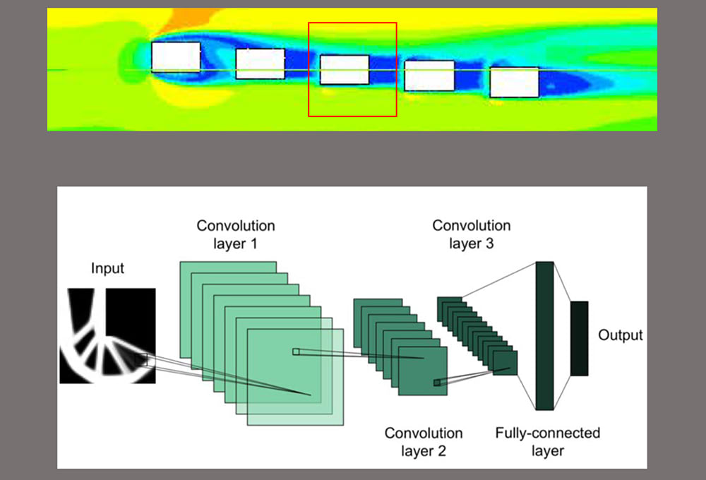 For longer platoons, convolutional neural networks (CNN) can be used to create a modular single-truck surrogate when the input layer is an image. CNN is a machine-learning approach to analyze images and has been widely used in image classification, segmentation, detection, etc. “So, you could use image-based approaches in order to predict the performance or the response,” Meidani said, adding that using a physics constraint (partial differential equations) can better train image-based surrogates (CNNs).