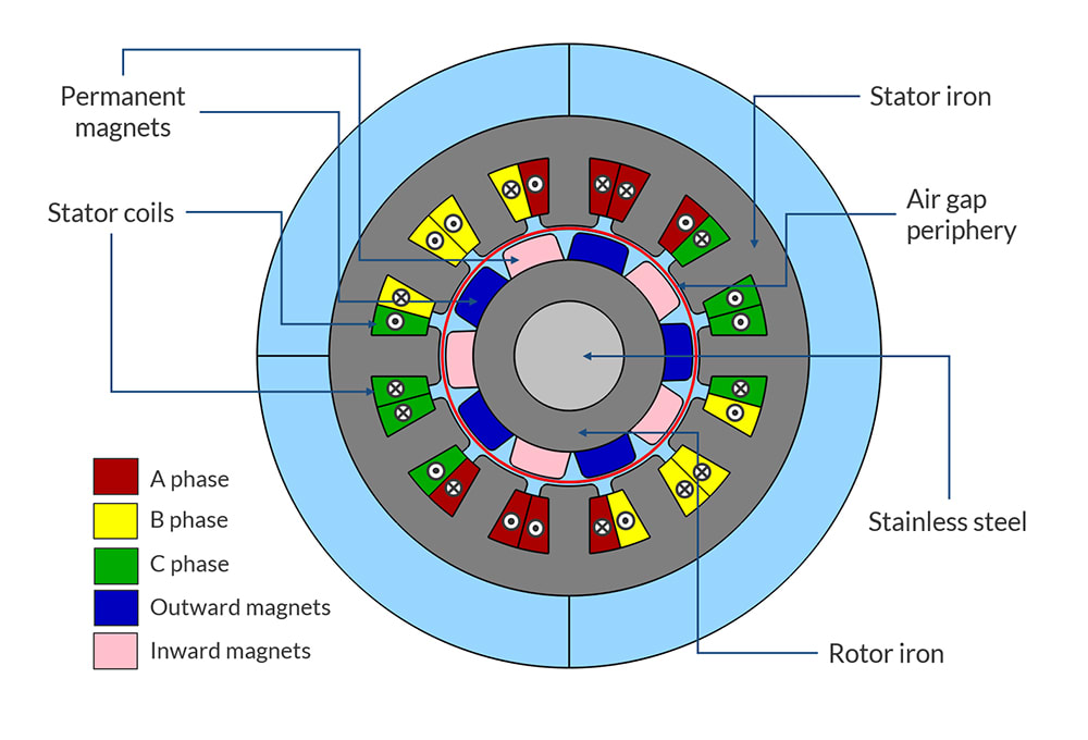 The schematic of the PMM shows the essential elements of the machine. From the modeling and simulation perspective, there are four main constituents: the stator iron, rotor iron, rotor permanent magnets, and the stator coils. The stator excitation usually consists of three phases: A, B, and C. The excitation pattern shown in the schematic is just one of the ways in which a 12-slot, 10-pole machine can be excited.