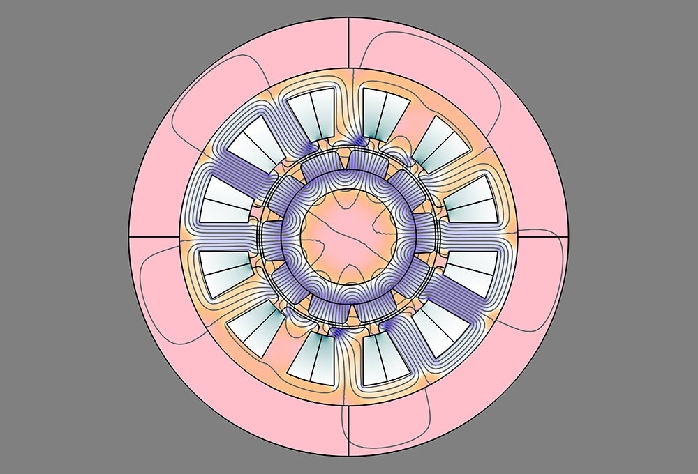 And because they are electronically controlled, PMMs offer fast response. They’re key to the impressive acceleration rates – as swift as 0-60 mph in less than two seconds – being achieved by some EVs. Simulation is a critical tool for e-machine design and analysis. In this article, we discuss a model of a PMM with 12 slots and 10 poles, analyzed using COMSOL Multiphysics software. The machine model has an 80-mm (3.15-in) axial length and 35-mm (1.37-in.) outer diameter. The model featured here can be used to study motors or generators by modifying the conditions for the inputs.