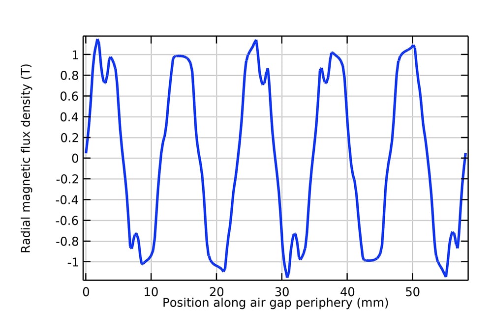 If there is a nonsinusoidal MMF wave, higher-order harmonics will be present in the induced stator voltages. For a generator, the presence of harmonics will result in poor power quality supplied to the power system, while for a motor any higher-order harmonics imply wasted power and therefore reduced efficiency. From the COMSOL simulation of the PMM, we obtain the magnetic field distribution and the air gap MMF wave. Simply by inspecting the MMF wave in this case, we know that there will not be a purely sinusoidal voltage induced in the stator phase.