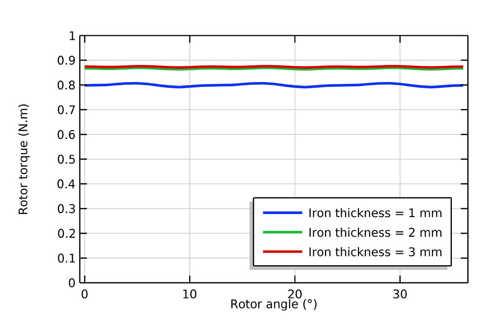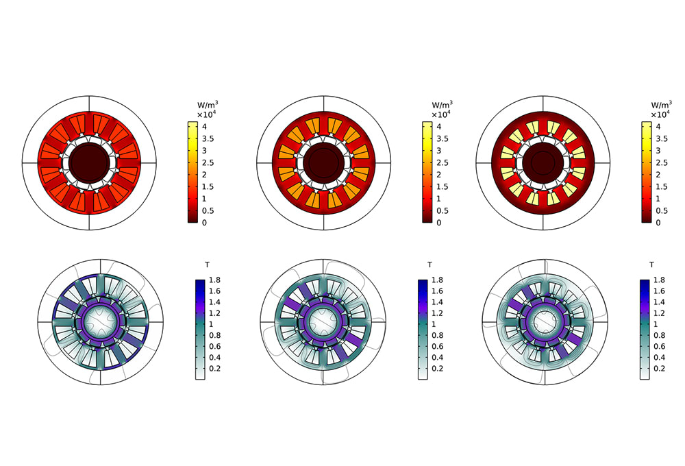 That is not the complete picture, however. While determining iron thickness, factors including mechanical strength and electromagnetic losses also play an important role. We can also evaluate the effect of varied iron thickness on iron losses, while analyzing the flux density and EM torque. COMSOL Multiphysics has a Loss Calculation feature that can be used to easily compute copper losses and iron losses via the Steinmetz equation, the Bertotti formulation, and a loss model defined by the software user.
