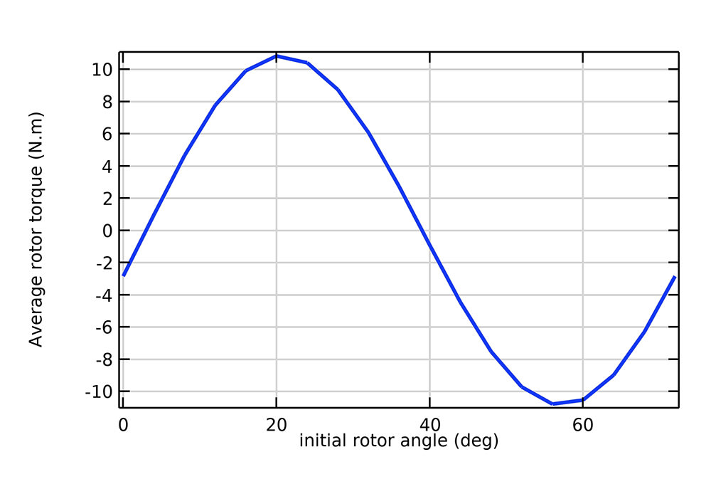 We choose the initial angular displacement corresponding to the maximum average torque as the rotor's initial position. Therefore, it is easy to visualize the relative positions of the stator and rotor that produce the maximum torque. This study illustrates the use of parametric sweep in COMSOL Multiphysics to vary the motor's design parameters and analyze their effects on the motor performance with ease.