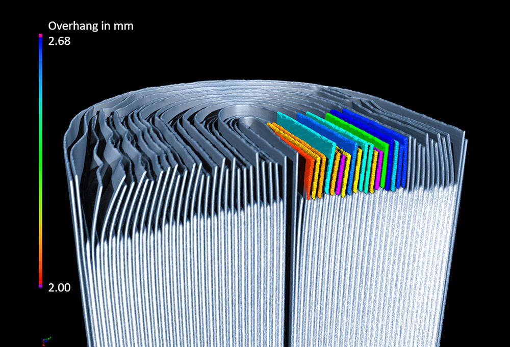 An important internal dimension to be monitored during manufacturing is anode overlap. The anode is always dimensioned so that it overlaps the cathode. This is to counteract lithium plating and possible damage to the cell. Lithium plating means that pure Li is deposited in the anode; it then is no longer available for the formation of ions. But a constant anode protrusion requires high precision in manufacturing. It is defined by the manufacturer and can be checked using CT analysis software. Finally, engineers can use CT for inspection and forensics in the after-sales phase to determine the cause of a device failure.