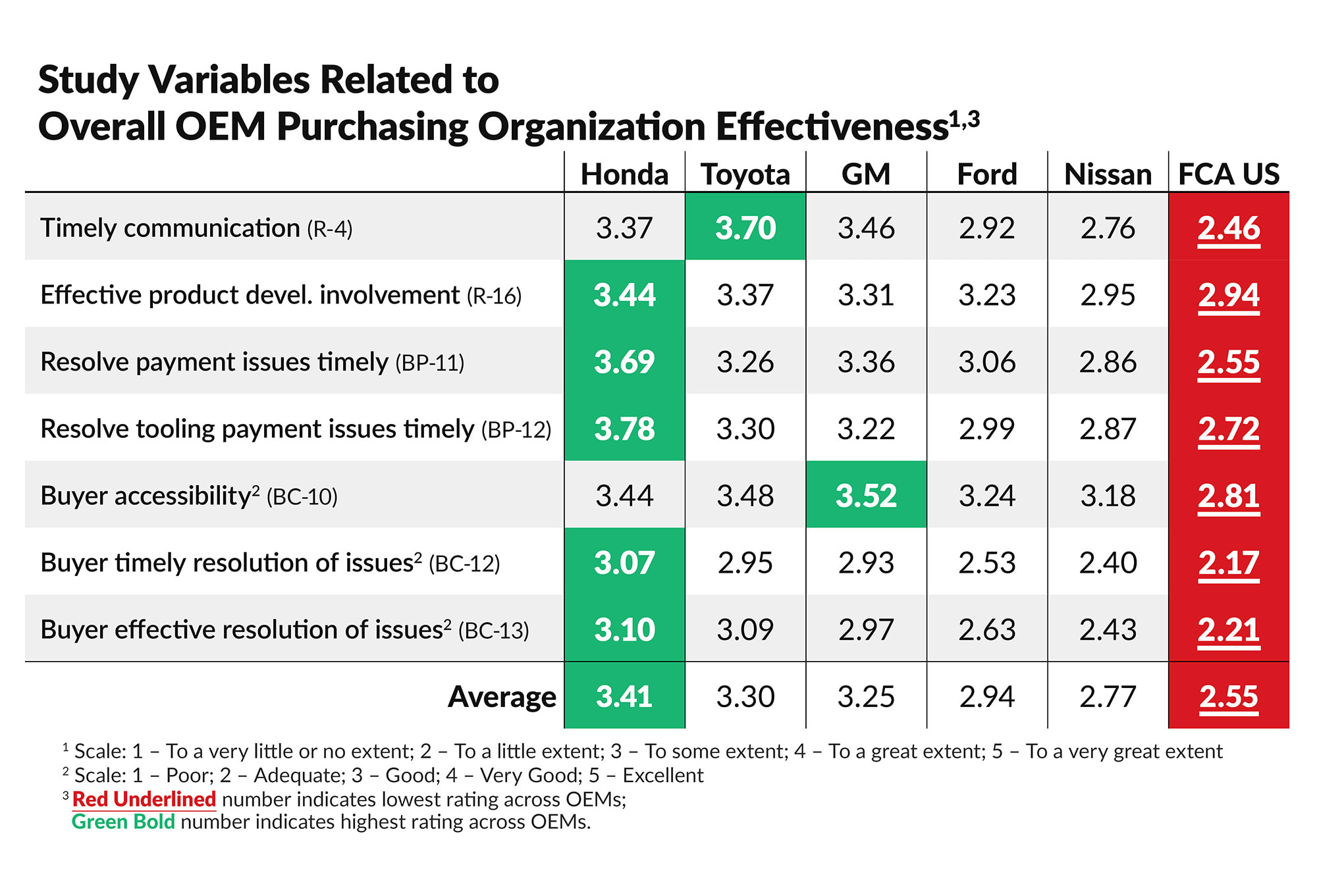 “Fewer engineering late changes and better alignment between engineering and purchasing during sourcing decisions were components of Nissan’s and GM’s higher WRI ratings,” Andrea said. FCA US/Stellantis scored the lowest overall points, and recorded the lowest points relating to timely communication, effective product development involvement and five other variables that impact overall OEM purchasing organization effectiveness.