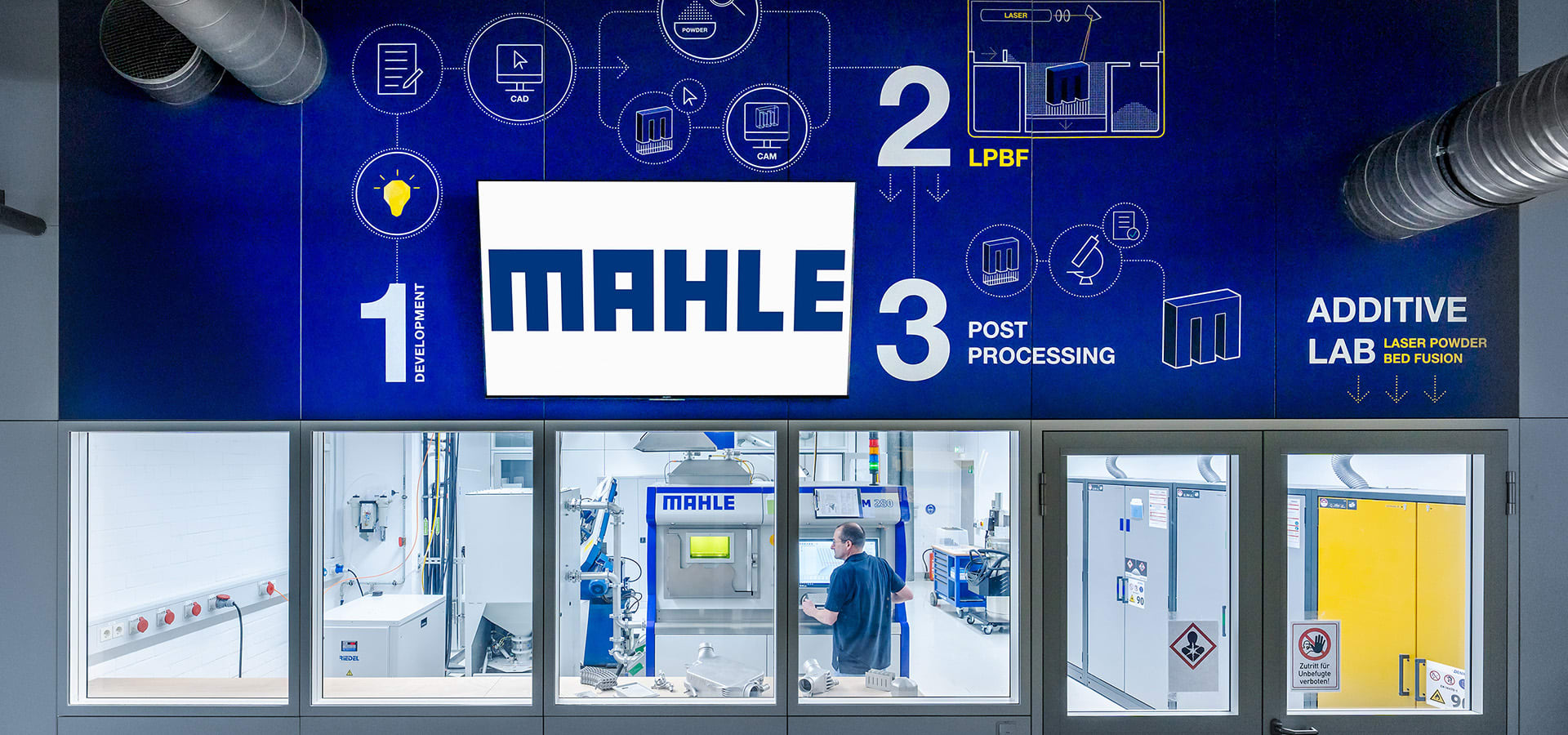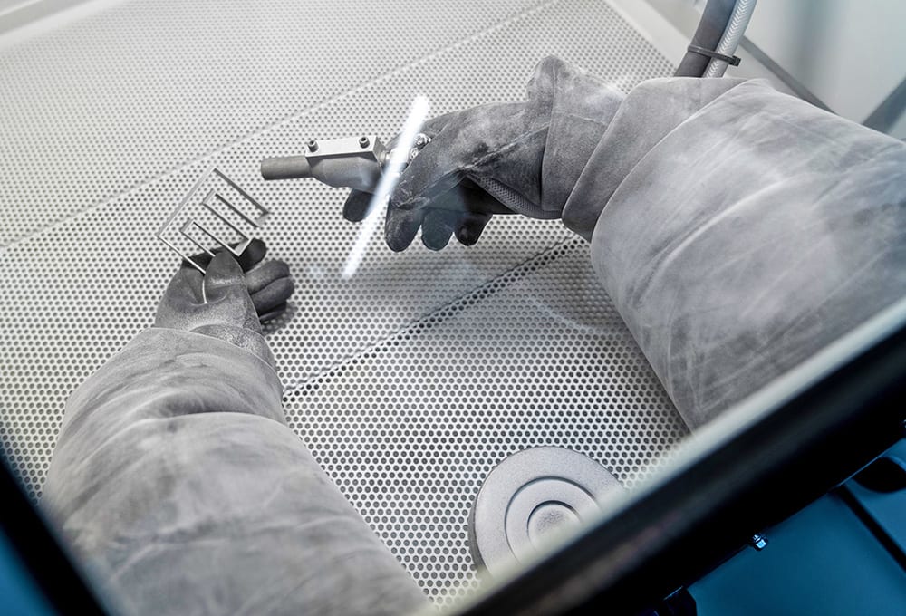 Laser powder bed fusion is used to form the component layer by layer. Mahle currently can manufacture components up to around 30 x 30 x 40 cm (11.8 x 11.8 x 15.7 in). After the printing process is complete, the finished parts are separated from the base plate and finish-machined by hand by specially trained staff.