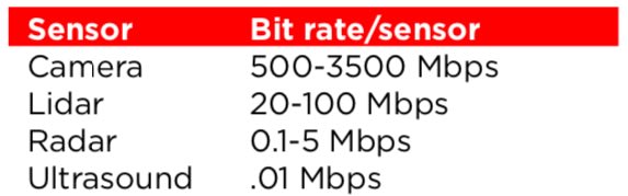 The following table shows typical volumes of data from the different sensors involved in autonomous driving:
