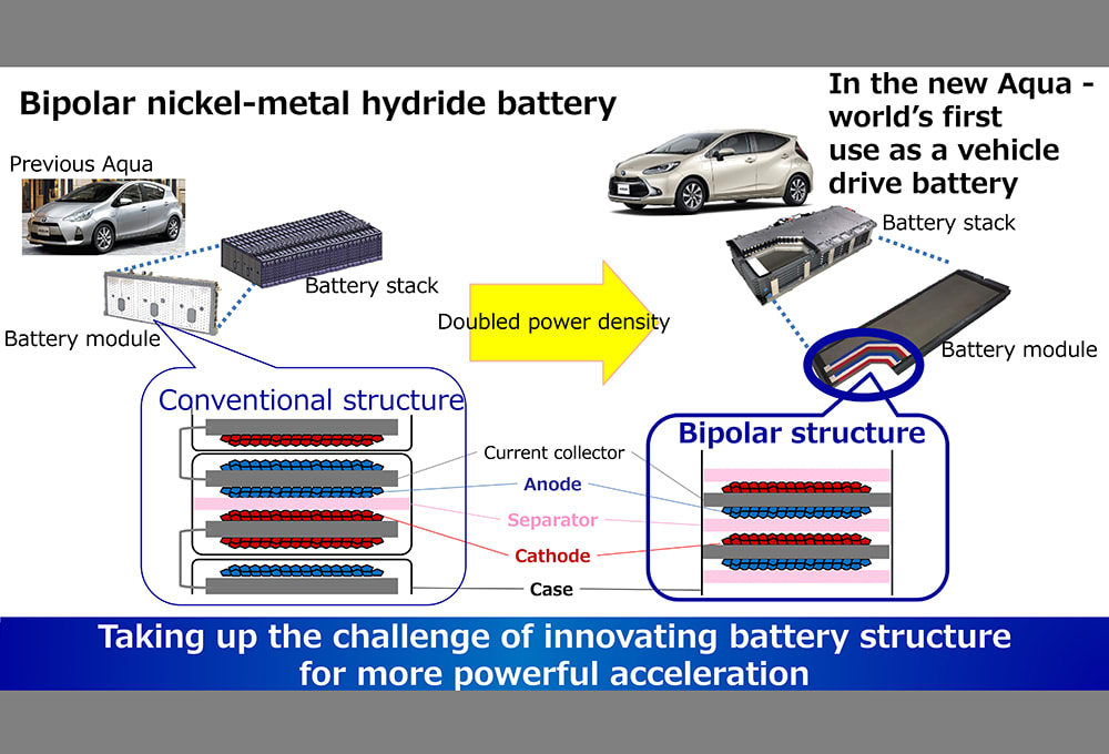 For HEVs, he mentioned a new generation of the company’s longstanding nickel-metal hydride chemistry with a “bi-polar” design that is said to double power density by consolidating the anode and cathode structures on opposite sides of the current collector. The layout also markedly reduces the footprint of the battery. Launching with the recently revealed Aqua compact car, the battery will be proliferated among other Toyota HEVs, Maeda said.