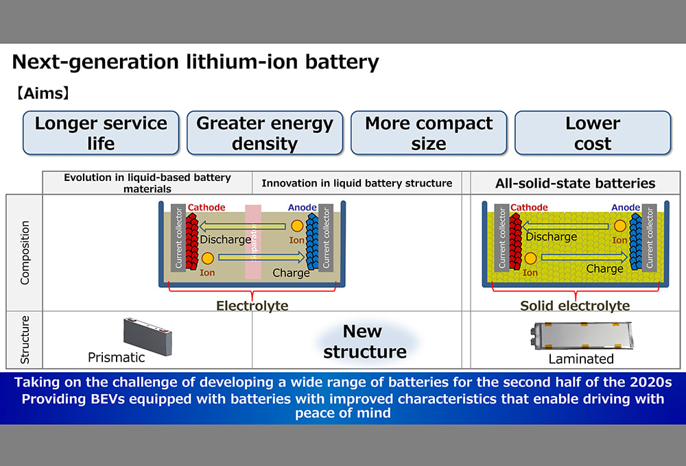 Solid-state batteries will enable faster charging, improve energy output and expand driving range, but among other things, “we found that short service life was an issue. To solve this and other issues, we need to continue development, mainly of solid electrolyte materials.” He added that the company would prefer to first launch solid-state batteries in HEVs.
