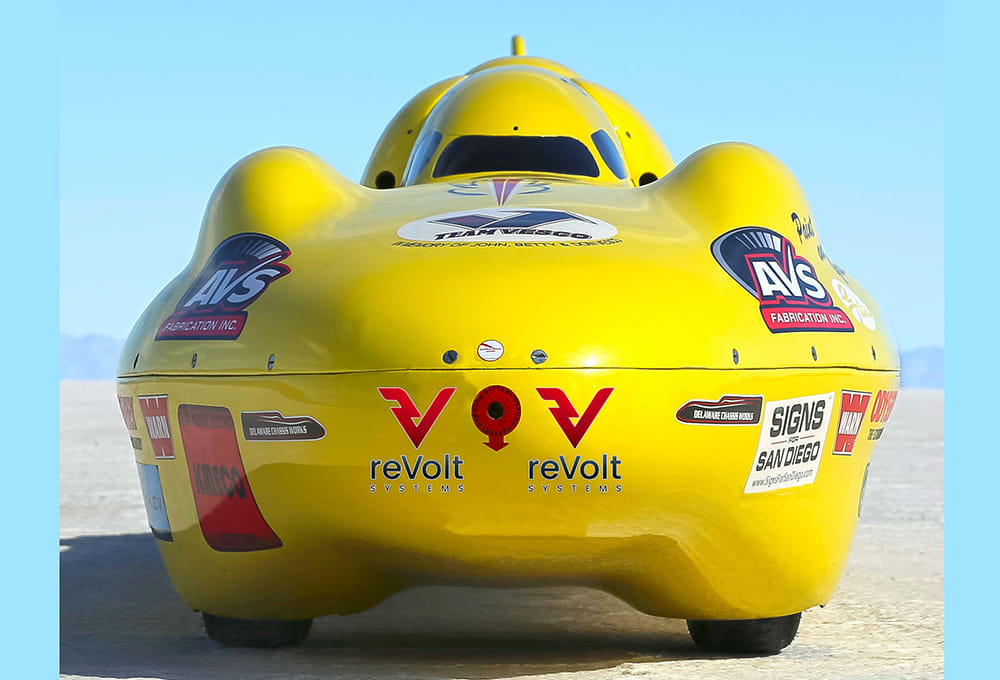 At the 2021 World Finals event hosted by the Southern California Timing Assoc. (SCTA), Team Vesco’s veteran racers strapped on an additional challenge. Allied with reVolt Systems, they turned a cold shoulder to combustion while attacking the SCTA’s 322.231 mph (518.58 km/h) E3 electric record. On October 1, designated driver Eric Ritter, a New York City sanitation-truck mechanic, steered his 444 Little Giant streamliner straight into the record book with a 353.870 mph (569.498 km/h) two-way average, making it the fastest battery-electric vehicle (BEV) certified under U.S. national rules.