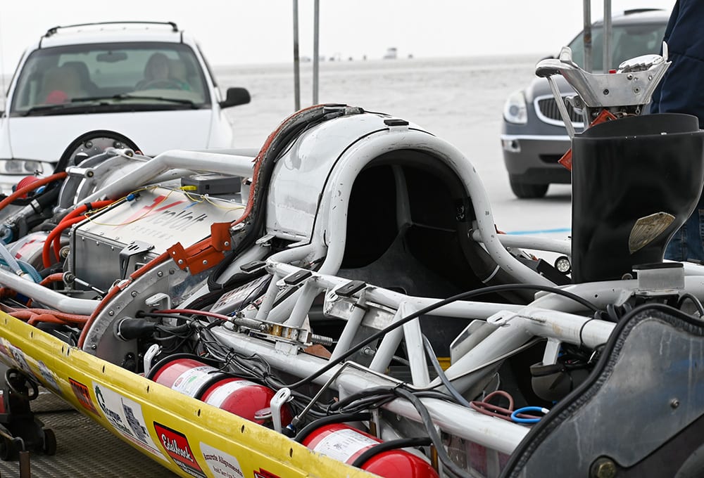 ReVolt’s Borysewicz, Greg Peek of American Track Roadster and engineer Trenton Wonsley patiently progressed through six stages of design and development in the seven or so weeks between the SCTA’s Speed Week and World Finals events. A homemade battery testing rig employing two heat guns and a toaster oven proved that the new battery pack could deliver maximum current without melt down. On the salt flats, a Tier 4 solar trailer provided the necessary energy to recharge the battery pack.