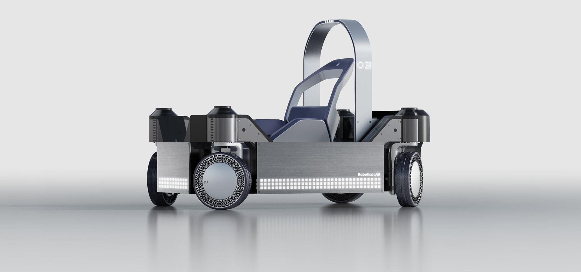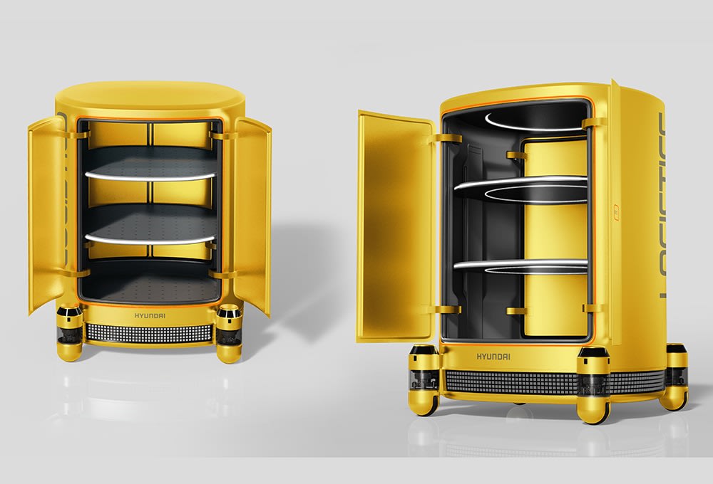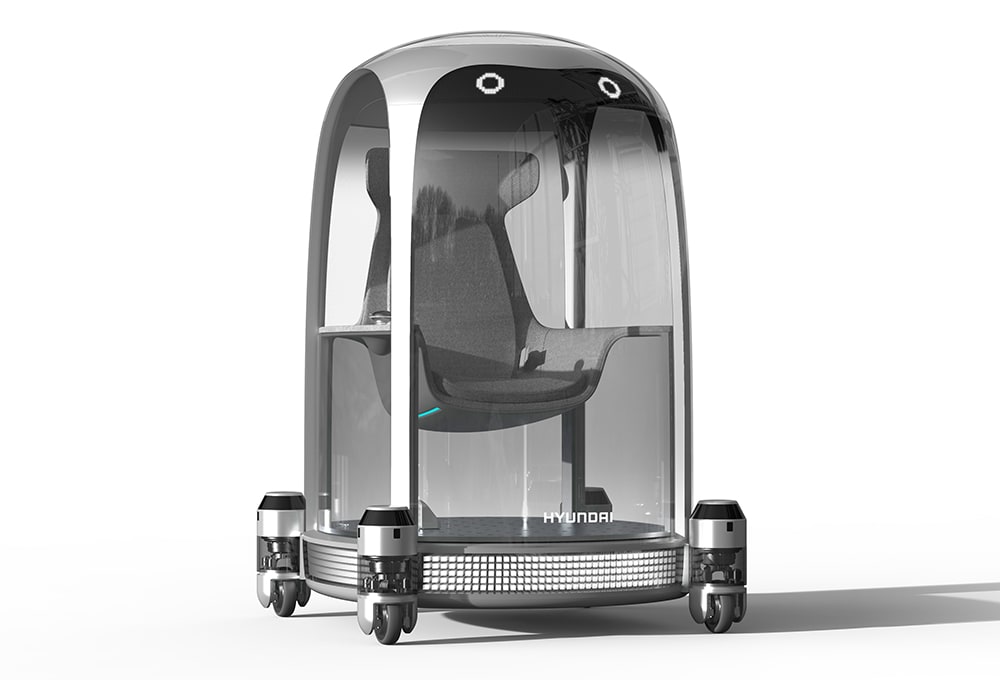 Using the same PnD platform, the Service Mobility and Logistic Mobility concepts have drawer-like storage bins. Hyundai envisions the Service Mobility unit as being used for “diverse applications, such as transporting customers’ luggage in hotels,” while the Logistics Mobility is designed for moving materials and goods in industrial environments. The L7 combines four larger 12-inch (30-cm) PnD modules at each corner and a seat that rotates so that passengers can get on and off easily. It is operated with a joystick and can also be reconfigured sans seat to carry packages or equipment for logistic applications.