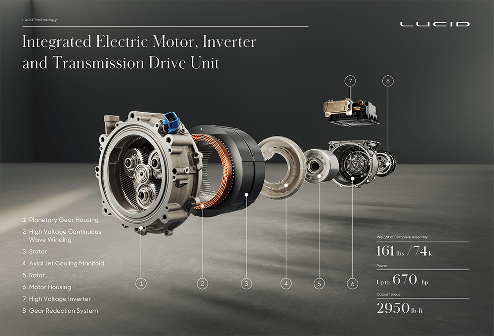 Lucid already has won acclaim for its Air motors’ combination of monstrous power – ranging from 480 hp to 670 hp, depending on trim and battery-pack configuration – and industry-leading driving range. To get there, chief engineer Bach said the company’s engineering teams focused on efficiencies – chiefly windings and thermal management, but even gear-tooth design – for its highly power-dense yet ultra-compact PM motor. (The company claims the entire drive module can fit in an airline roller bag and weighs just 163 lb [74 kg]). The Air platform’s system architecture also operates at 900V, which also has a significant impact on power potential.