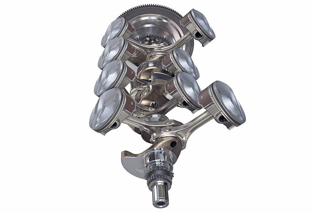 To stay within an optimum displacement range to make the LT6 suitable for worldwide endurance racing and to also help address the vibration issues that can afflict V8s with flat-plane crankshafts, the LT6 fronts a short stroke of just 80 mm compared to its bore of 104.25 mm. The flat-plane V8, a longstanding preference of Ferrari (a recent example of which GM purchased from a salvaged model) allows for improved exhaust-scavenging behavior and is a key enabler of enhanced volumetric efficiency and high-rpm power.