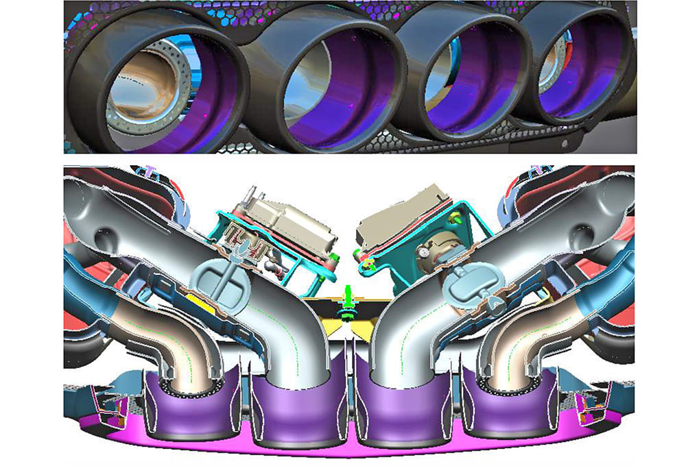 The sealed crankcase bays, say GM’s engineers, reduce piston pumping losses as well as crankcase windage losses. Oil scavenging is also improved thanks to the clever “scraper” design at the bottom of the crankcase and the high degree of crankcase vacuum. Meanwhile, the dry sump for the eight-quart oil supply for the LT6 (this is 1.75 quarts less than required by the LT4 V8 of the seventh-generation Corvette Z06) now is attached directly to the engine. It is rated for 1.25 g of lateral force and astonishingly retains 96% of the oil supply in the tank at redline, compared with 68% for the LT4 V8.
