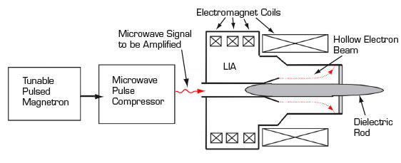 If, in particular, the electron beam were generated by a linear induction accelerator and had an annular cross section and the radiating antenna were of a dielectric-rod surface-wave type (see figure), then amplification of a drive signal generated by the magnetron could be achieved by means of the Cherenkov mechanism of interaction between the electron beam and surface waves on the antenna. In effect, the accelerator / antenna / electrodynamic - interactionspace unit would function as a travelingwave- tube amplifier. Moreover, by virtue of the physical principles of a linear induction accelerator, it would be possible to keep the cathode holder of the accelerator at ground potential, making it possible to connect the accelerator to the magnetron or other external drivesignal source. There would be no need for either a microwave transmission line between the amplifier and antenna or a mode converter for coupling the output of the amplifier to an external antenna. In addition, characteristics of the output radiation could be controlled.