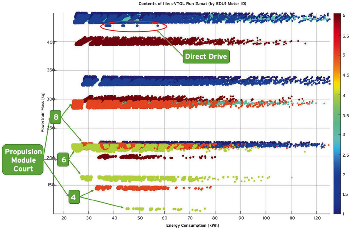 Even though there is no one-size-fitsall solution, the case study here has shown relevant points around use of a transmission, the number of propulsion modules, and how primary and secondary variables interact to produce an array of viable options in the mass and energy consumption space – summarized in Figure 4. For our specific study, we could select from the pareto front the propulsion architecture and system highlighted in Figure 5, with 6 propulsion modules using a common 57kW motor design. As is always the case, no clear system type or technology will win the day and remain in place for the foreseeable future, so we need to be comfortable with continued change as eVTOL technology matures and evolves and we are able to project how these changes might influence an overall system.