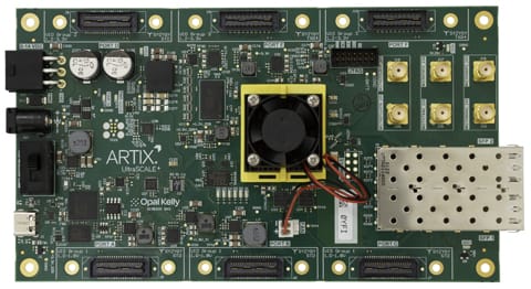 Opal Kelly (Portland, OR) announced the XEM8320-AU25P, the official development platform for the Xilinx Artix UltraScale+ FPGA. The new platform features Opal Kelly’s FrontPanel® SDK for building high-performance, software-connected FPGA applications. The XEM8320-AU25P also leverages the versatile SYZYGY® modular connectivity for rapid prototyping and expansion. The XEM8320-AU25P features the Xilinx Artix UltraScale+ XCAU25P-2FFVB676E FPGA and USB 3.0 Type C SuperSpeed interface. The platform also includes 11 high-speed gigabit transceiver lanes via Artix UltraScale+ transceivers. Artix UltraScale+ transceivers support serial standards such as 10 GbE, JESD-204B, DisplayPort, PCI Express, SATA, HD-SDI, XAUI, and Aurora.