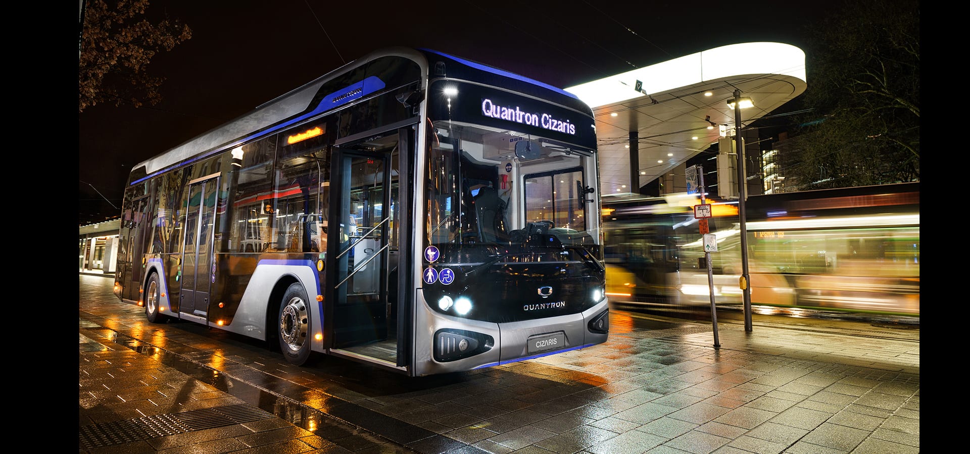 Quantron is working in partnership with Chinese manufacturer EV Dynamics to produce the Cizaris. The design features temperature-controlled lithium iron phosphate (LFP) roof-mounted battery packs produced by CATL, with up to six in the front section and up to six in the rear section, depending on customer requirements. This will provide 242 kW/h, 281 kW/h, 363 kW/h or 424 kW/h of battery capacity.
