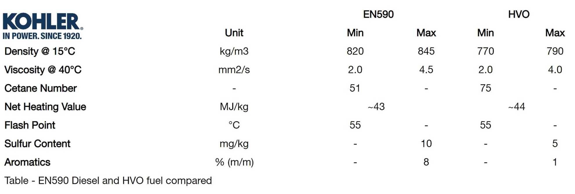 Kohler Engines recently approved use of EN15940-compliant HVOs for its entire diesel ICE lineup in Europe. The company claims that the utilization of HVO will enable a reduction in CO2 emissions of their diesel ICEs by up 90% (“depending on the raw material employed in HVO production”) and that no engine modifications are required for their diesels to operate on pure or blended HVO.