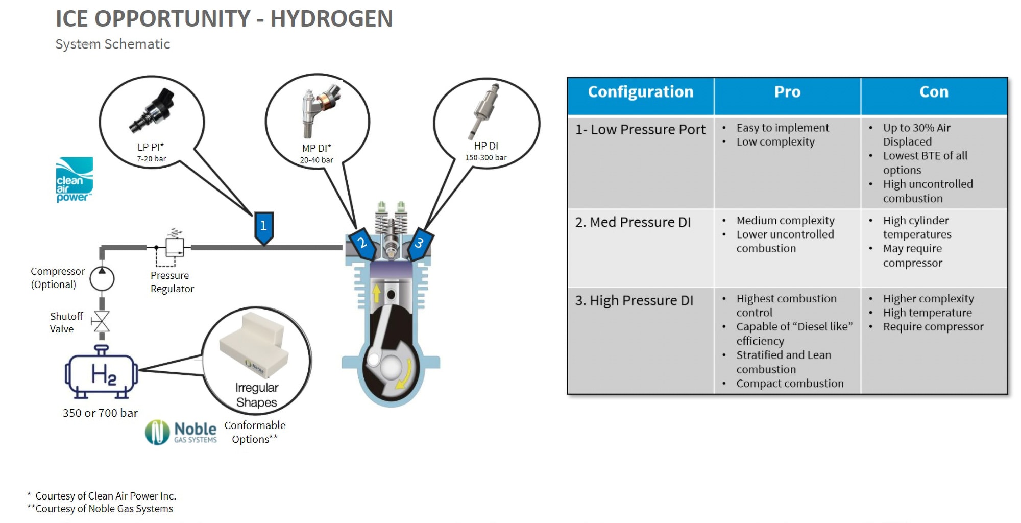 Stroia also covered the pros and cons of various H2 injection systems for ICEs. While PFI systems (7-20 bar/100-300 psi) are relatively easy to implement and low complexity, they suffer from up to 30% air displacement, result in the lowest BTE (brake thermal efficiency) and have a high probability of uncontrolled combustion. “PFI is very easy to implement [for H2] compared to PFI CNG. DFI H2 has advantages because you’re able to manage things after the valves are closed such as uncontrolled combustion and preignition,” Stroia said.