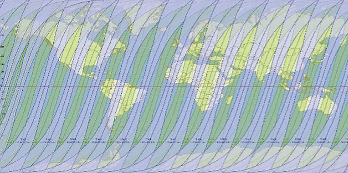 Coverage and revisit rate (how much of the earth you can see and how often) are two defining features of satellite constellations. Figure 2, extracted from the Pléiades Imagery User Guide (ASTRIUM, 2012), shows the global coverage available from two satellites. Using both satellites with view angles within ±30°, the revisit rate is 1.3 days or better above 40° latitude and 1.7 days at the equator. With view angles within ±45°, daily revisits are possible. A nadir view has a view angle of 0° and is looking straight down.