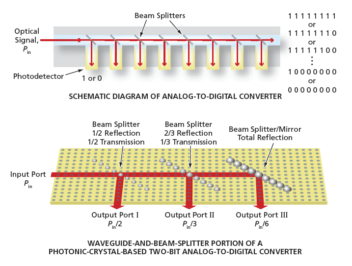 The lower part of Figure 1 depicts the layout of the waveguide-and-beam-splitting portion of a two-bit ADC of this type based on a two-dimensional photonic-crystal/waveguide structure. The splitting ratios shown in the figure are chosen in consideration of the nonlinear photodetector response. When Pin < 2Pth, the output powers at all three output ports are <Pth and, consequently, the quantized state of the photodetector outputs at the three output ports is hence defined as “000.” When the input power is slightly above 2Pth, the output power at port I only is slightly above threshold, making the quantized state “100.” Similarly, as Pin increases, causing the power levels at the other output ports to rise above Pth, their quantized states change from “0” to “1.” The net result is that as Pin increases past integer multiples of Pth, the quantized states exhibit the sequence “000,” “100,” “110,” and “111.” These four states can be coded into the states “00”, “01”, “10”, and “11” of a two-bit ADC.