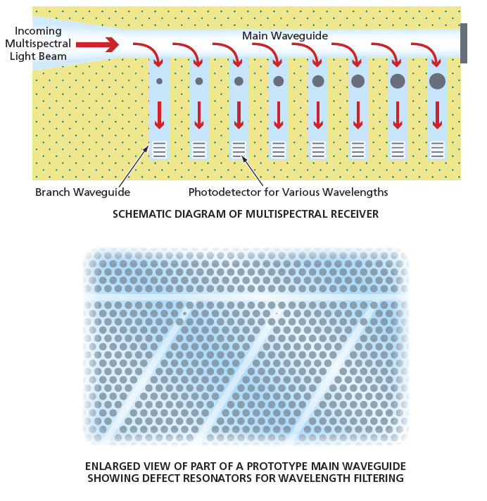 Figure 2 illustrates the principle of operation of a photonic-crystal-based multispectral receiver, part of which has been built and tested. A multispectral infrared beam is launched into a two-dimensional main photonicband- gap waveguide that supports propagation at the wavelengths of interest. The waveguide is implemented as a periodic array of holes in a silicon-on-insulator chip. Resonators, implemented as localized defects in the photonic-crystal structure of the waveguide, are used for filtering light of individual wavelengths of interest into branch waveguides that, in a fully developed version, would lead to photodetectors. Proposed further developments include integration of a photonic-crystal-based multispectral receiver with ADCs and an optical switching network.