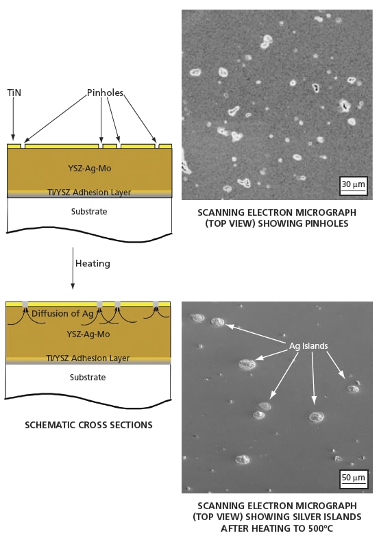 The YSZ-Ag-Mo composite coatings for the present experimental study were deposited on steel and nickel-alloy substrates in a hybrid process that included deposition of 100-nm-thick titanium adhesion layers by use of a filtered titanium arc plasma, followed by pulsed-layer deposition of YSZ from a YSZ target. Ag and Mo were added to the coatings by magnetron sputtering from Ag and Mo targets. All of the coatings were grown to a thickness of about 2 μm. In some cases, the coating was formed as two 1-μm-thick YSZ-Ag-Mo layers, and a 100-nm-thick TiN diffusion-barrier layer was deposited between the YSZ-Ag-Mo layers by introducing a flow of nitrogen into the deposition chamber during operation of the filtered titanium arc plasma source. In other cases, TiN barrier layers containing pinholes were deposited on the surfaces of YSZ-Ag-Mo coatings to limit through-the-thickness diffusion of silver (see figure).