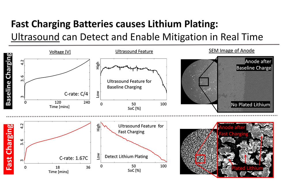 Early experimentation using ultrasound to evaluate effects (such as lithium plating) related to fast-charging also showed promising results. Figure 4 demonstrates how ultrasound signal features are drastically different when fast charging occurs (1.67C vs C/4).