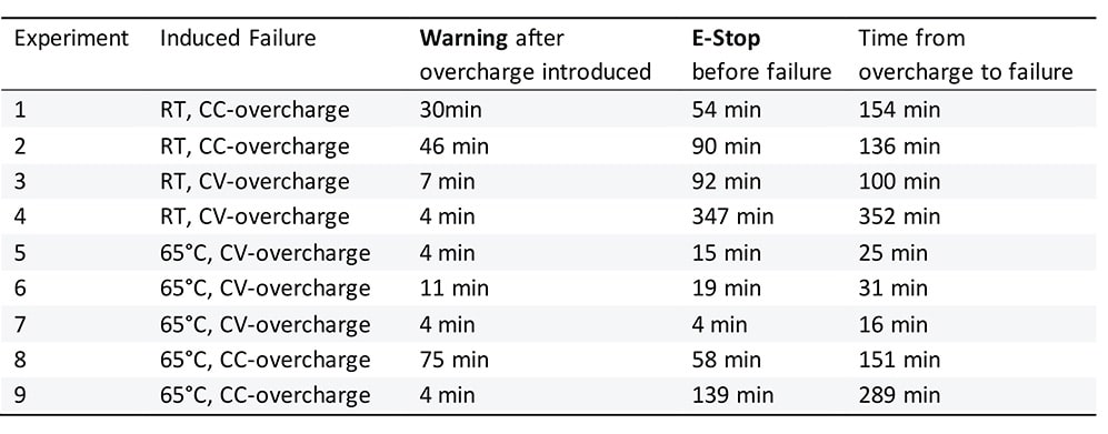 Repeatedly inducing four distinct failure types, Titan Advanced Energy Solutions has consistently identified a warning condition, allowing time to alter battery control, and an “E-stop” condition to disconnect the battery entirely to avoid catastrophic failure. For comparison, the Global Technical Regulation (GTR) No. 20 requires a 5-minute warning of battery failure to prevent human injuries (GTR is global regulatory organization under the United Nations Economic Commission for Europe, or UNECE).