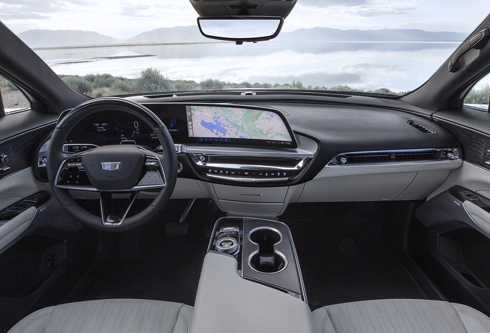 Driver-adjustable “one-pedal” driving enhances the deceleration experience and of course determines how much regenerative energy is returned to the battery. And Cadillac has innovated on the steering-wheel-paddle regen actuation introduced for the Chevrolet Bolt by making it a proportion-based action determined by how much the paddle is pulled, with deceleration ranging from 0.23g to 0.35g. It’s an engaging function that’s superbly executed.