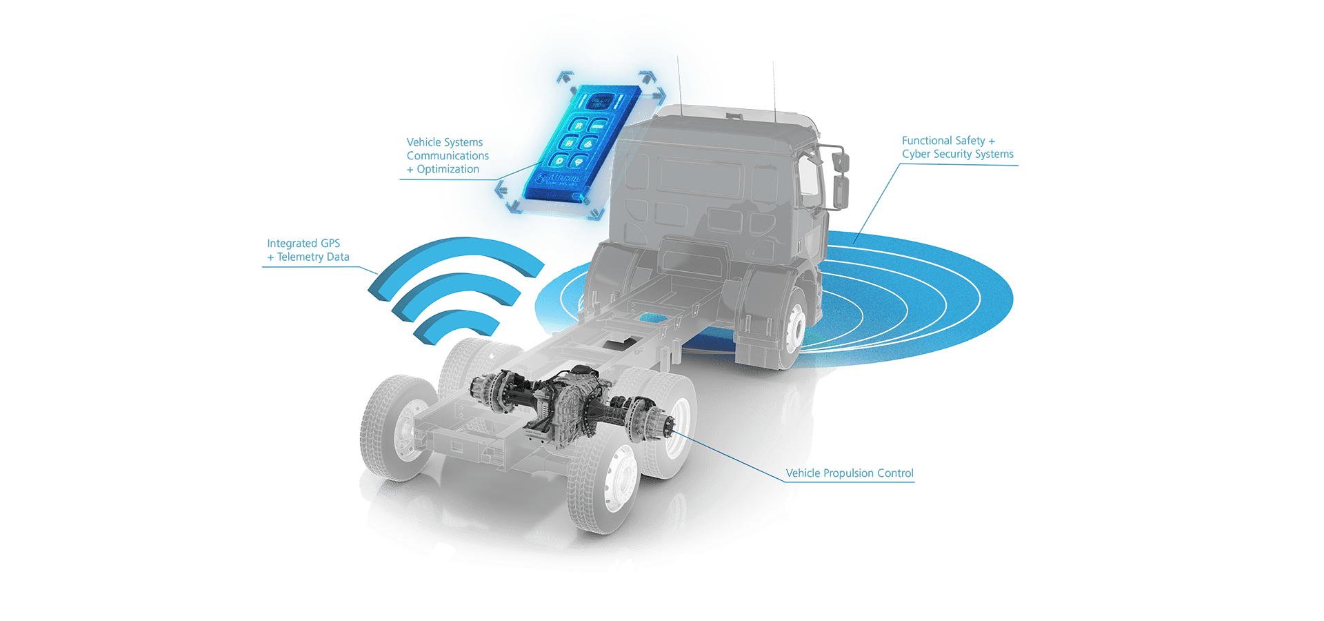It enables functional safety, which is emerging as a requirement in the commercial vehicle industry, cybersecurity and it also enables over-the-air programming. So through the vehicle telematics solution you’ll be able to actually provide new software updates, whether that be turn on new FuelSense features or address any issues that arise. [FuelSense uses a ‘learning algorithm’ to support key features such as DynActive Shifting to determine the optimal shift point; Neutral at Stop, which reduces the load on the engine when the vehicle is stopped; and Acceleration Rate Management to mitigate aggressive driving by automatically controlling engine torque.]