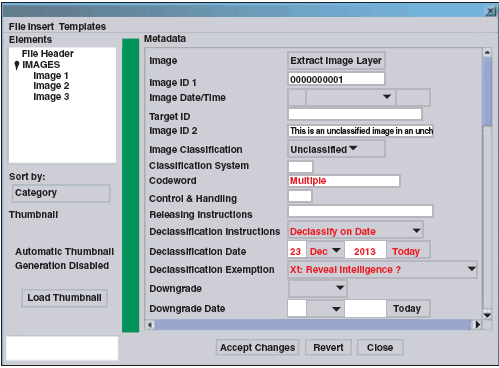 Motion imagery support provides basic controls for video play, pause, and frame advance. Frame-based MPEG-2 video multiplexing/demultiplexing and metadata decoding are available for parsing out geolocation information. The viewer also features basic operations for tracking and annotating objects, building video mosaics, and clipping out frames. Geo*View is National Imagery Transmission Format (NITF) 2.1-certified to complexity level 7 for reading and writing. It autopopulates and validates the NITF geospatial metadata and supplies an NITF metadata editor for updating and regenerating NITF-compliant data files (see Figure 2).