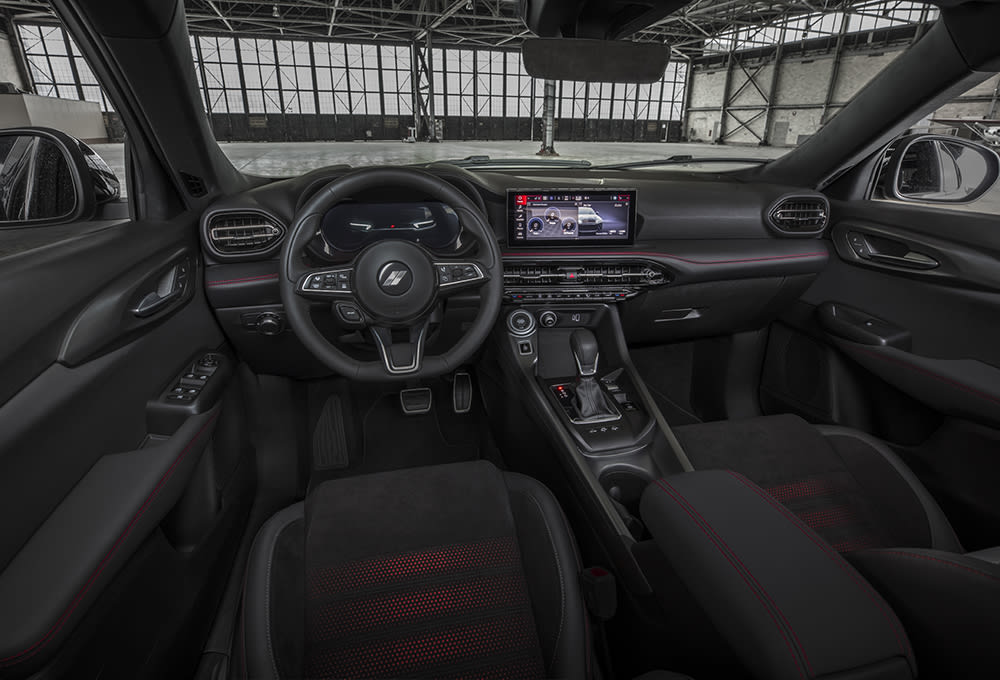 Hornet’s SAE Level 2 driver-assistance features include a lateral control/lane-keeping system, intelligent speed assist with traffic-sign recognition, driver-attention assist and intelligent adaptive cruise control. The entry-level GT’s technology features include all-wheel drive, torque vectoring, an electronic limited-slip differential, a 12.3-in (312-mm) thin-film transistor (TFT) gauge cluster screen, a 10.25-in (260-mm) center display, Uconnect 5 infotainment system and a wireless phone charger. Brembo four-piston, front-fixed calipers (unique to the class) are standard on the Hornet GT and available on the R/T. Both the GT and R/T offer an available Track Pack package with larger tires, upgraded suspension and other items.