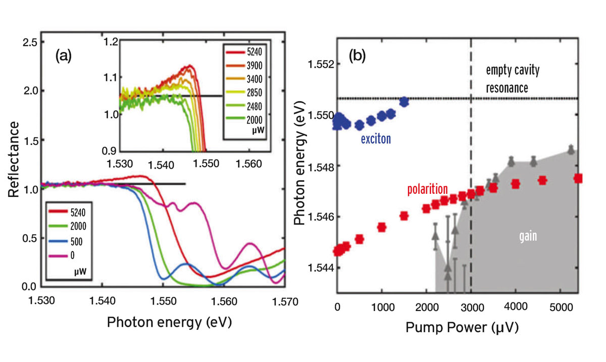 In the HPCC polariton system, both the weakly and strongly cavity-cou-pled excitons coexist and share the same hot carrier reservoir, enabling access to the electronic media at the presence of polariton lasing. In what would have been commonly accepted as a polariton BEC, fermionic gain and population inversion (Figure 3) were measured directly, unambiguously distinguishing it from a polariton BEC. Stark contrast in spectral properties between the BCS polariton laser and a conventional photon laser were also shown, thereby unambiguously distinguishing it from the commonly known photon laser. A theory based on extended semiconductor Bloch equation reproduces the experimental results and in turn reveals the BCS nature of the new many-body phase.