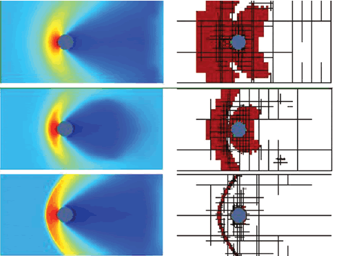 The UFS enables accurate and efficient simulation of gas flows for the entire Kn range. Figure 2 (see page 22) illustrates a two-dimensional (2-D) simulation of supersonic gas flow (at Mach=3) around a cylinder for three different Kn values. The left side of each image depicts the density profiles, and the right side shows the computational grid and separation of the kinetic (red) and continuum (white) domains. Figure 3 (see page 22) shows UFS simulation results for a nozzle with subsonic flow (Mach=0.2) at the nozzle entry for Kn values=0.01 and 0.001. The UFS employed both the Boltzmann and Euler solvers to perform these calculations. The grid adaptation is based on the parameter δ = log (ρ) + log (μ), where ρ is the gas density and μ is the gas velocity.