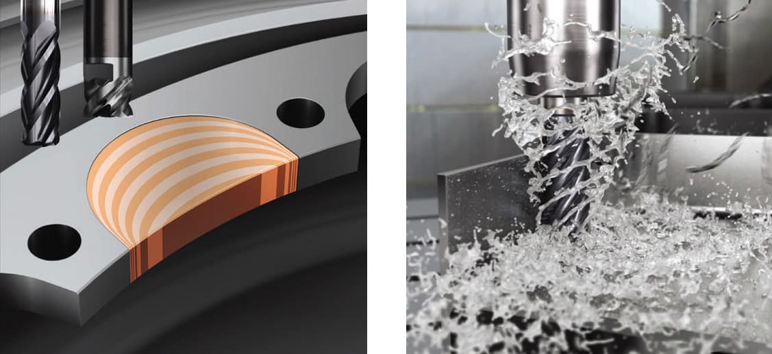 To utilize this method, aerospace machining operations need to consider specialized milling tools. Sandvik Coromant for example has developed the CoroMill® Plura HFS high-feed side milling range. The range features a series of end mills with unique geometries and grades and is made up of two end mill families. One family is optimized for titanium alloys, the other for nickel alloys. Chip evacuation and heat are specific challenges when machining titanium, so the first family presents a solid version of the tool for normal chip evacuation conditions. The second family features internal coolant and a cooling booster for optimum swarf and temperature control.