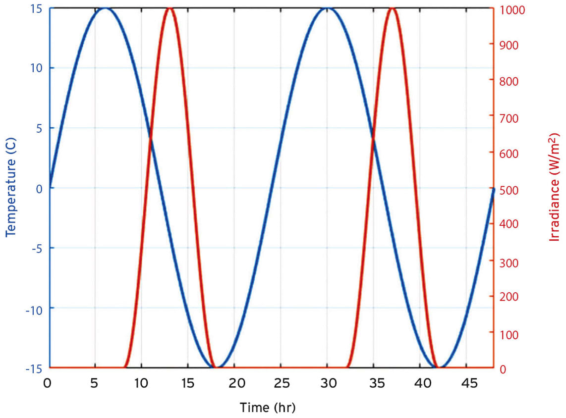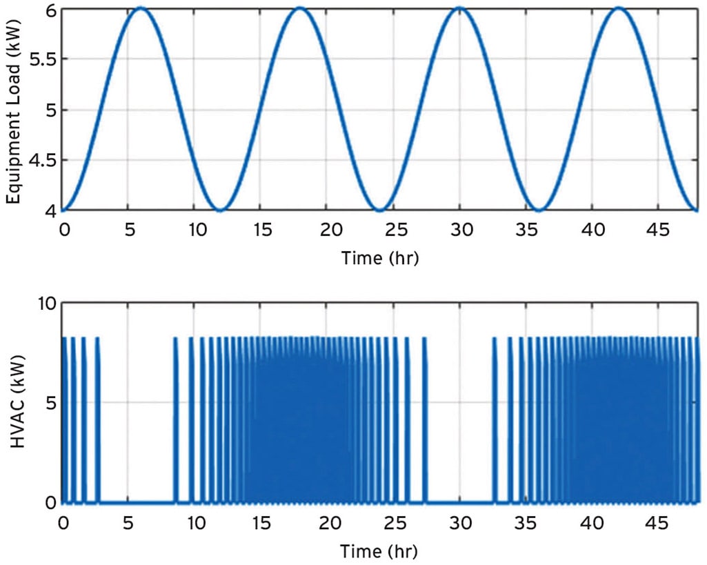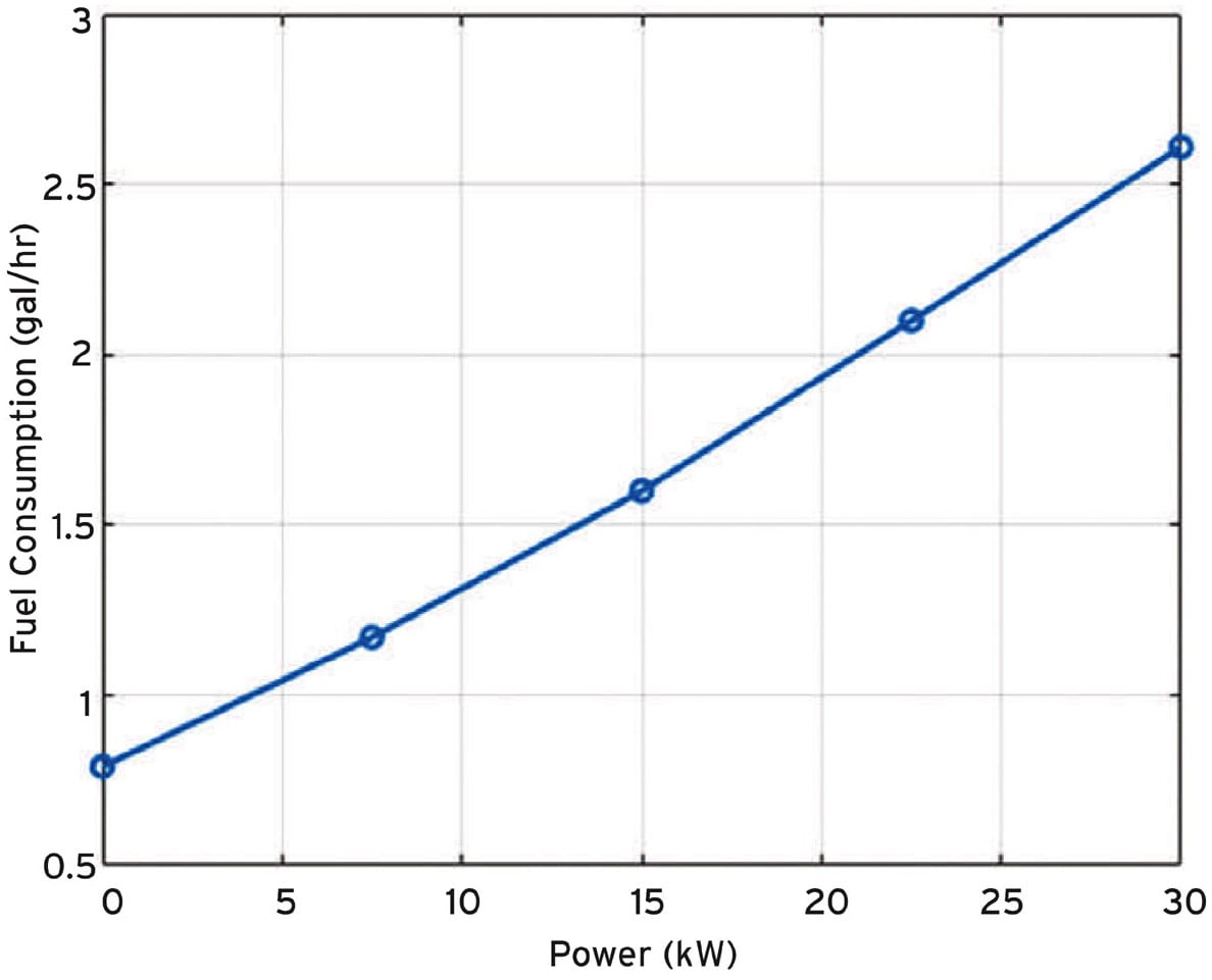 Consider an energy network that is commissioned to operate for the next 48 hours. Let this network consist of a 30-kW diesel generator, 10-kW photovoltaic (PV) array (subject to a clear sky), 360-kWh battery storage (at a 24-hour discharge rate), and a variable electrical load. Let the variable load be composed of two load types: one which is invariant of the operating environment and one which is a function of atmospheric conditions (such as the load to run heating, ventilation, and air conditioning [HVAC] units). Electrical load, atmospheric conditions, and generator fuel consumption characteristics examples are provided in Figures 1, 2, and 3, respectively. For this example, the resulting electrical load requires 700 MJ of energy. This energy must be provided by the generator, storage, PV array, or some combination of the three. Assuming there is no future atmospheric intelligence, the PV array will likely be underutilized and as a result, excess fuel and energy storage requirements will likely be incurred.