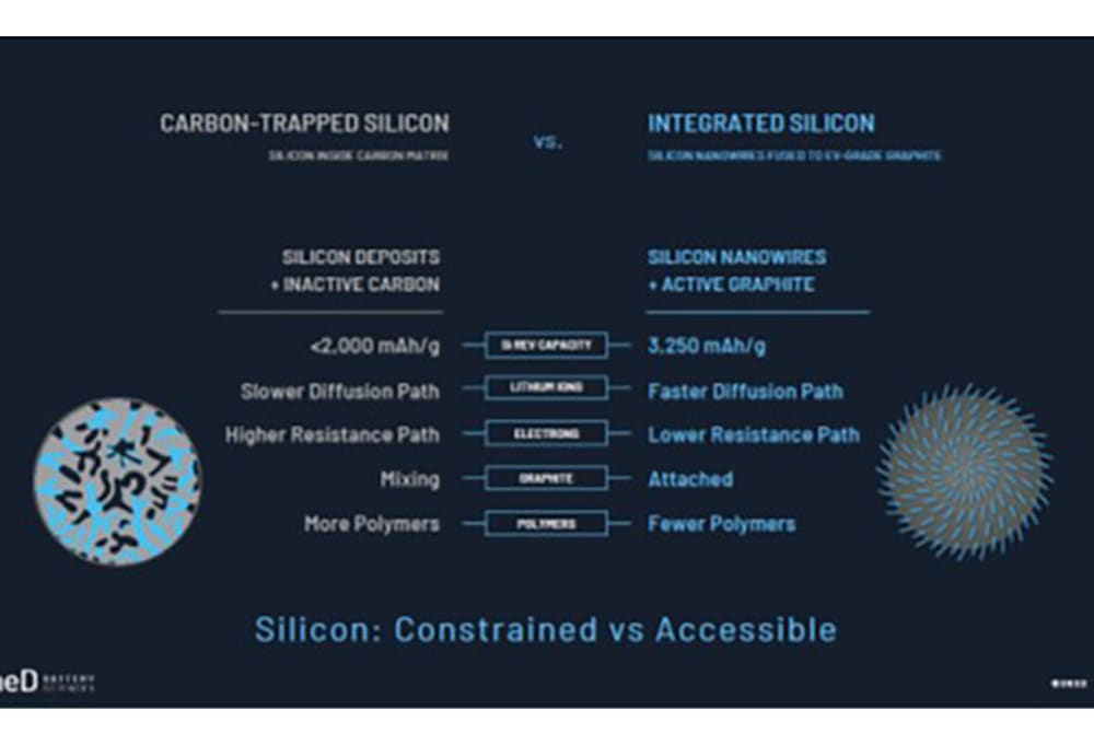 Although graphite (carbon) has served as the industry’s stalwart anode material during lithium-ion batteries’ early volume-production phases, OneD and its competitors know that silicon’s unique properties can greatly enhance the performance of batteries with graphite-only anodes. The challenge is how to incorporate silicon with graphite to derive the most performance benefit — and do it within the constraints of a constantly pressured cost structure that virtually demands battery prices are markedly reduced if EVs are to sell in high volumes in almost every world region.