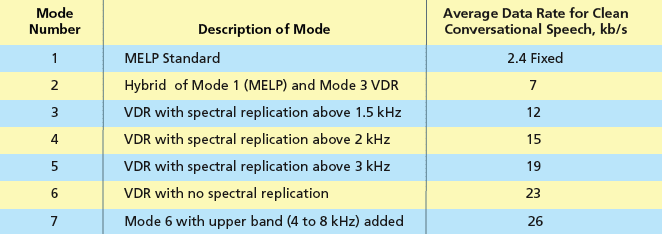 The heart of the VDR voice encoder is a multirate voice processor in which a single voice algorithm generates multiple data streams at rates from 2.4 kb/s to an average rate of about 23 kb/s for input speech at frequencies from 0 to 4 kHz. The algorithm provides for seven different operating modes (see table). Inclusion of a few more kb/s of data from the 4-to-8-kHz audio frequency band makes it possible to encode wide-band speech comparable in quality to that of standard frequency-modulation (FM) broadcasting.