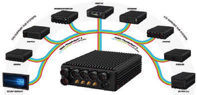 General Micro Systems (GMS) (Rancho Cucamonga, CA) announced its X9 Spider family of distributed, ruggedized computing modules offering interlocking mechanical design, MOSA Thunderbolt™ interfaces, OpenVPX cross-platform compatibility, and patented Light-Bolt™ connectors. Features of the X9 Spider family include: Two “Host” modules powered either by Intel’s® latest 11th-generation Xeon W (Tiger Lake-H) 8-core CPU, or by NVIDIA’s® Jetson AGX Orin GPGPU with ARMcore engine, plus GPGPU CUDA and Tensor cores; interconnectivity via the COTS open standard Thunderbolt™ 4 technology, developed by Intel® and Apple® and 100Gb Ethernet over fiber; and six (6) companion X9 modules that include a “workstation” with removable storage and up to 14 sites for add-in I/O like MIL-STD-1553, a network “switch” with four 100Gb and eight 10Gb Ethernet ports, and a removable canister with up to eight high-density M.2 or U.2 SSD storage devices.