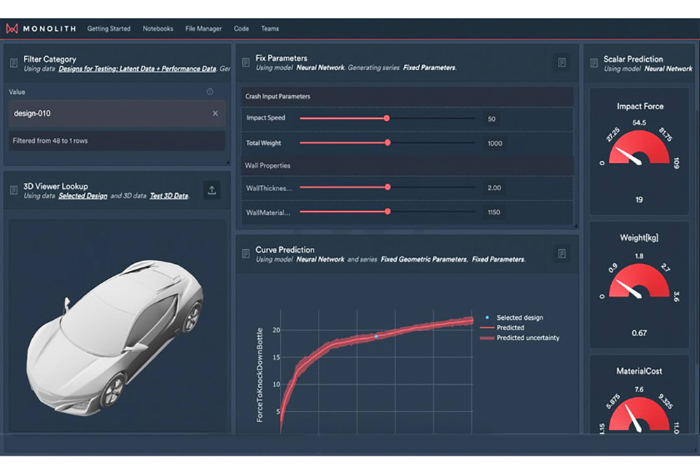 For BMW, the Monolith team helped the engineers use machine learning to uncover patterns. “One crash test may look like random noise,” he said, “but if you run pattern recognition over 10,000 tests you can figure out the problem and solve it, meaning BMW can achieve a [NHTSA] 5-star safety rating and, as a result, sell more cars.” He said it shaved months off the normal development time because they could do fewer full-size prototype crash tests. “It can cut development time by as much as 50 percent.”